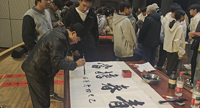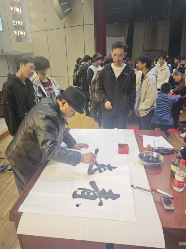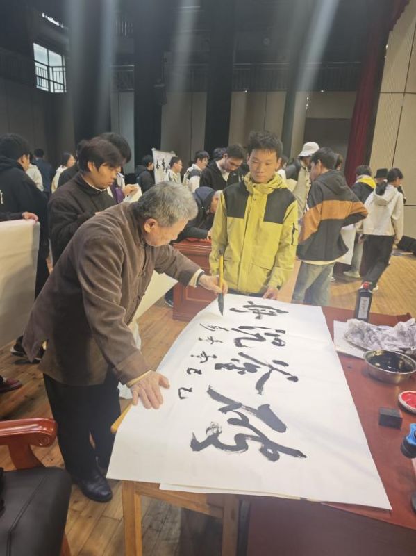 理论授课后,现场挥毫赠字环节将活动推向高潮。张绍宏、阳瑞祥、龙万仲、梁名军四位老师铺展宣纸,挥毫泼墨。“天道酬勤”、“笃行致远”、“青春无悔”等一幅幅承载着期许的佳作跃然纸上。同学们有序排队,踊跃请赠,或凝神观摩运笔之道,或就自己喜爱的词句与老师交流。现场气氛热烈,墨香与欢声笑语交织,同学们在沉浸式体验中,深切感受到了中华传统文化的博大精深与时代活力。