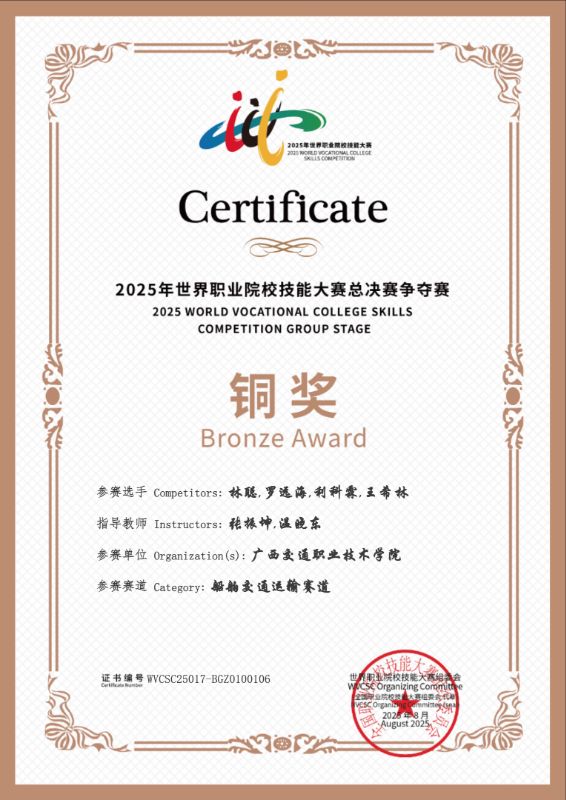 王希林自中职阶段起,便始终秉持积极进取的学习态度,养成勤于钻研、乐于思考的良好习惯。2023年,他通过广西对口升学考试升入广西交通职业技术学院《船舶工程》专业继续深造,求学路上,他未曾有丝毫松懈,而是将中职阶段练就的扎实技能与高职专业知识深度融合,不断打磨实操本领,最终在世界职业技能大赛的舞台上脱颖而出,绽放光彩。