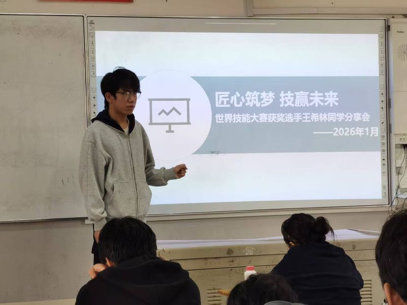 2026年1月17日,我校《汽车运用与维修》专业2102班优秀毕业生王希林载誉归来,重返母校与学弟们开展技能比赛经验交流分享会。在2025年世界职业技能大赛中,王希林凭借扎实的专业功底和出色的临场发挥斩获铜奖,为母校争光添彩。