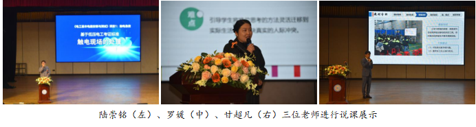 随后进入教学展示与经验分享单元。三位在各级教学大赛中荣获佳绩的教师进行了精彩的说课展示:陆崇铭老师(全国展示案例获得者)呈现了《基于低压电工考证标准——触电现场的处理》;罗媛老师(市赛一等奖)分享了《换位思考 搭建心的桥梁》;甘超凡老师(市赛一等奖)讲解了《汽车车身修复与涂装技术——塞焊实训》。三位老师的说课精准对标、设计精巧,充分展现了教学智慧。
