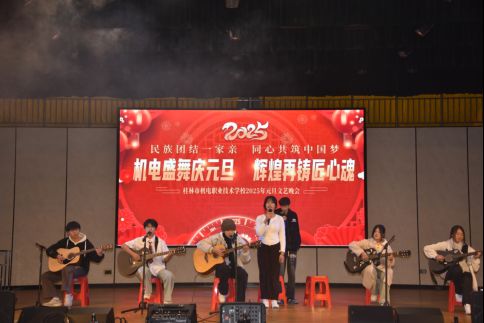 2024 年 12 月26日晚,桂林市机电职业技术学校内灯光璀璨、热闹非凡,以“机电盛舞庆元旦 辉煌再铸匠心魂”为主题的 2025 元旦文艺晚会隆重举行。全校师生齐聚一堂,共同迎接新年的到来。